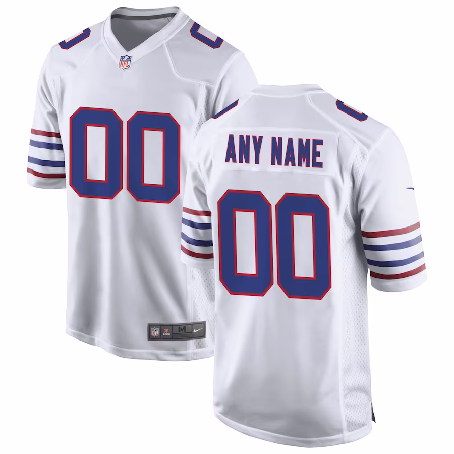 We want fans to celebrate their fandom by customizing and personalizing certain products. For these customizable products, including jerseys, we invite customers to tell us how they would like their preferred name or other text to appear by typing that text into the field indicated. However, just because a customer is able to type proposed customization text into the field and is able to complete the order through the website, not all proposed customization text will be accepted. Please note, We may reject and cancel any customization order for any reason, including for messages that are deemed offensive or inappropriate. Take your Buffalo Bills fandom to the next level when you grab this Custom Game Jersey. This Nike gear is perfect for an avid Buffalo Bills fan like you who never misses a moment of the action. The crisp graphics will put your unwavering pride on full display and ensure everyone knows who you're rooting for at the next game!