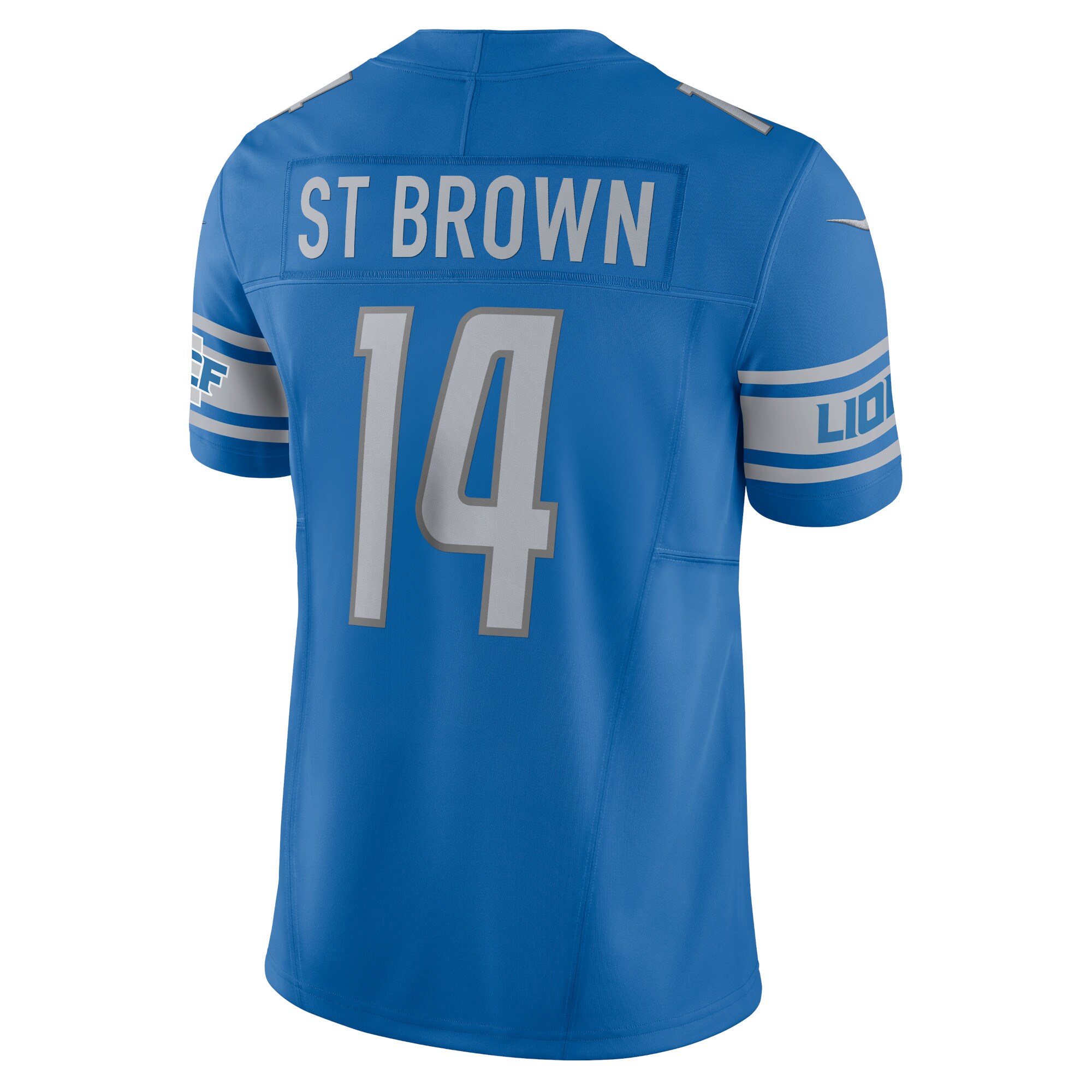Walking into the stadium, you feel a rush of energy pass over you. You adjust your Detroit Lions Limited jersey and feel yourself getting swept up in all the electricity of the game. This Nike jersey features the state-of-the-art Vapor F.U.S.E. chassis, which delivers an incredibly authentic look and feel so that you might even believe you're out on the field with the Detroit Lions. The twill name and number graphics will ensure that your devotion to Amon-Ra St. Brown is seen by everyone in the stadium. Dri-FIT fabric technology keeps you cool as you're jumping up and down while the Detroit Lions win the game.