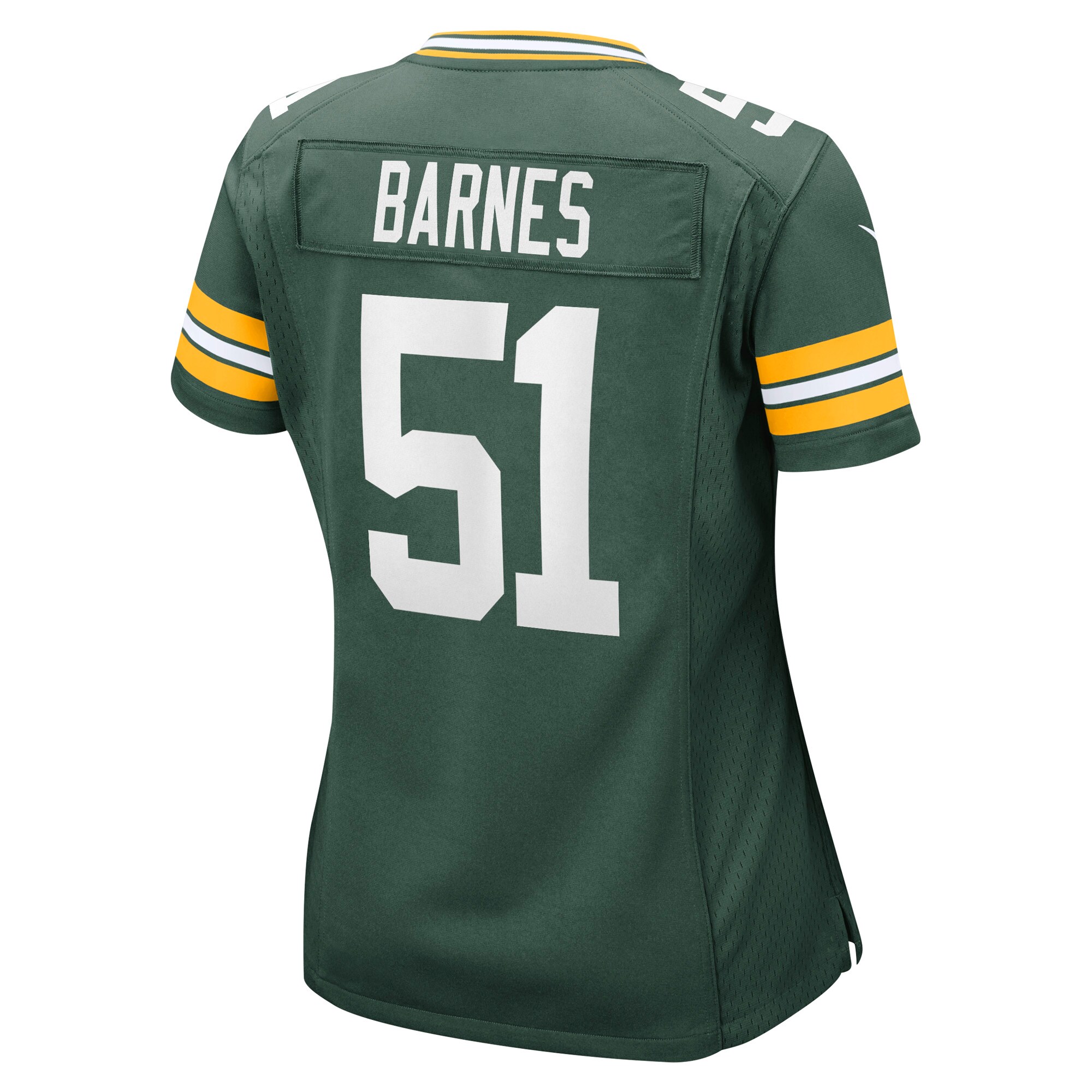 Rep the on-field look of your favorite Green Bay Packers player with this Krys Barnes Game jersey from Nike. Its heat-sealed name, numbers and team details provide a kickoff-ready aesthetic while also offering a comfortable, lightweight feel. Designed for everyday movement, this jersey has a versatile tailored fit and features mesh side panels for added ventilation as you celebrate every big play by the Green Bay Packers this season.