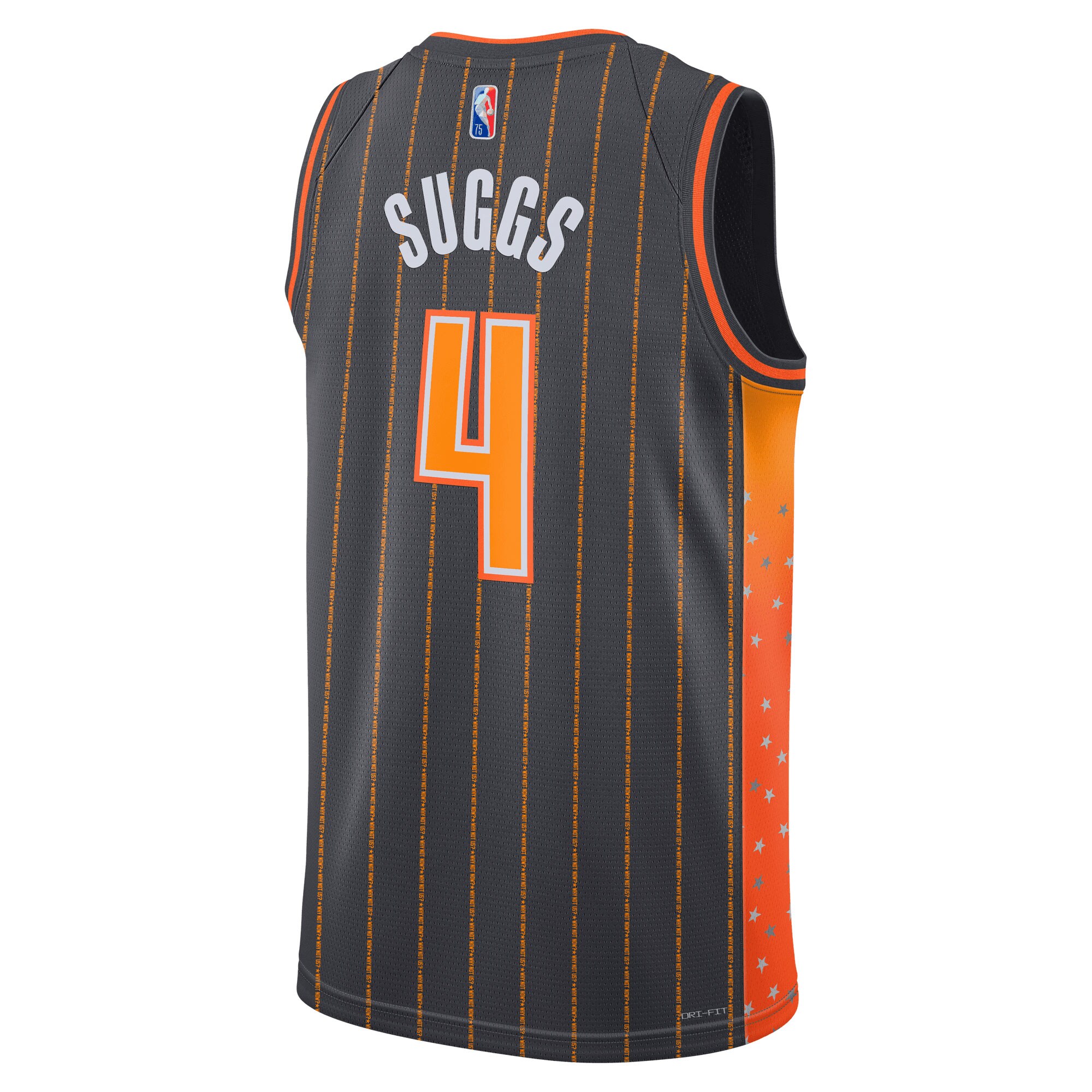 Inspired by Orlando's famous sunshine and citrus, this Jalen Suggs 2021/22 City Edition jersey from Nike puts a freshly squeezed spin on the Magic's orange theme of years past. The highlights of this updated version are the unique pinstripes with the words, "Why not us? Why not now?" printed up and down the uniform - a rallying cry by the Magic's late Chairman Rich DeVos and used as the team's inspiration in the '90s. The throwback "Magic" script on the chest, accompanied by the iconic star, is a nod to the original font and design. These are just a few of the details that will make this a magical addition to your selection of Orlando gear.