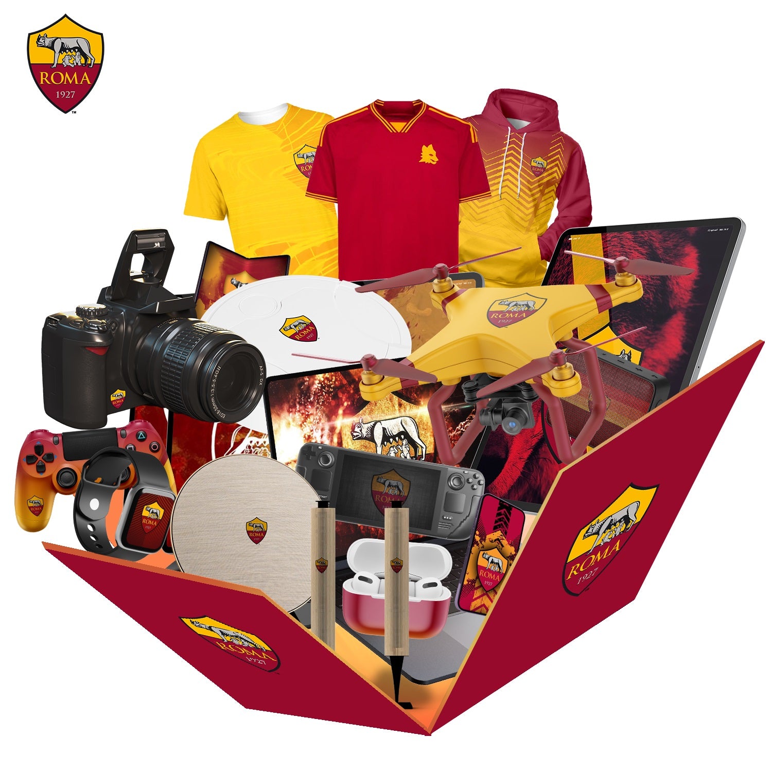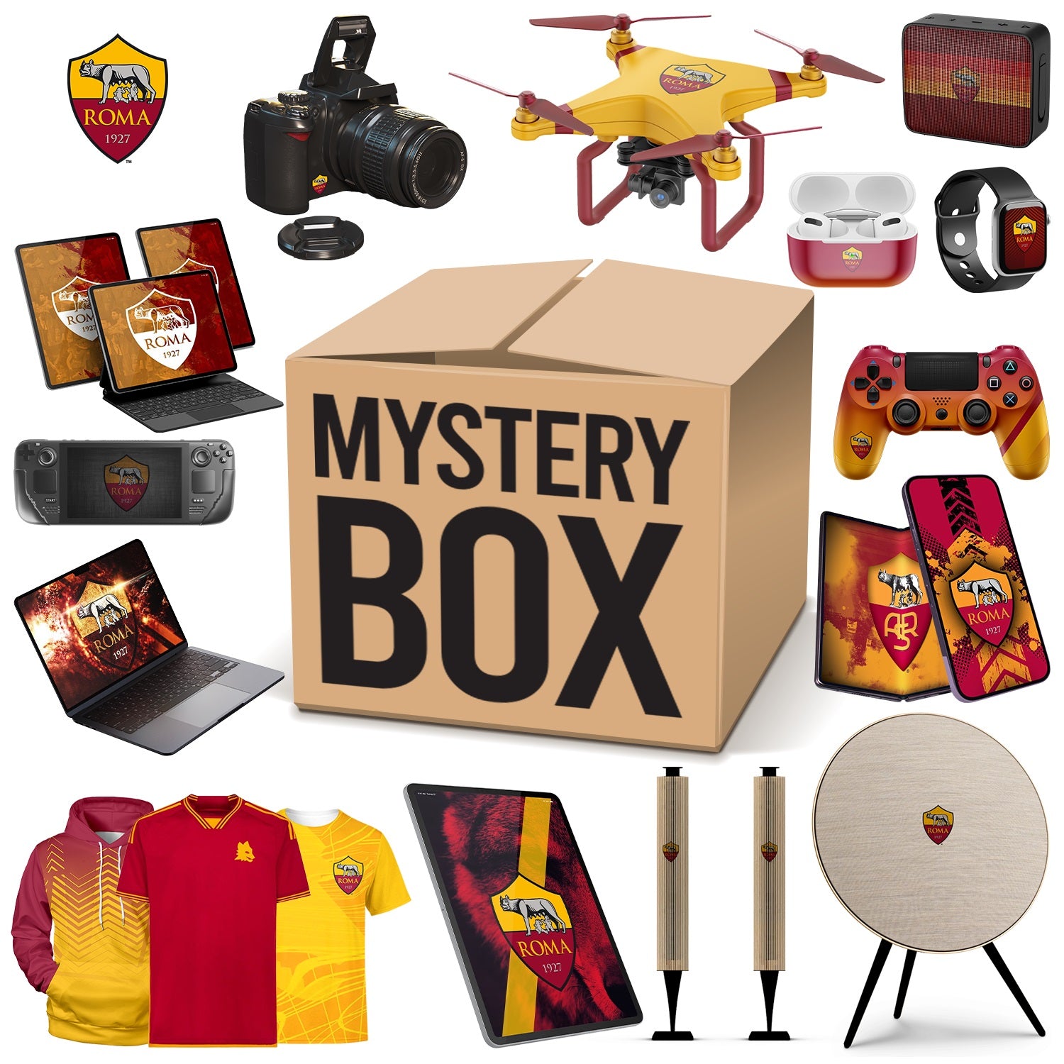 A limited number of AS Roma will be available during the holiday season. Related products will be shipped randomly. Including Touchscreen Watches, Joystick Consoles, Mobile Phones, Drones, Sweepers, Tablets and other products. (Gift box value exceeds $1,000). All items are AS Roma related gifts.